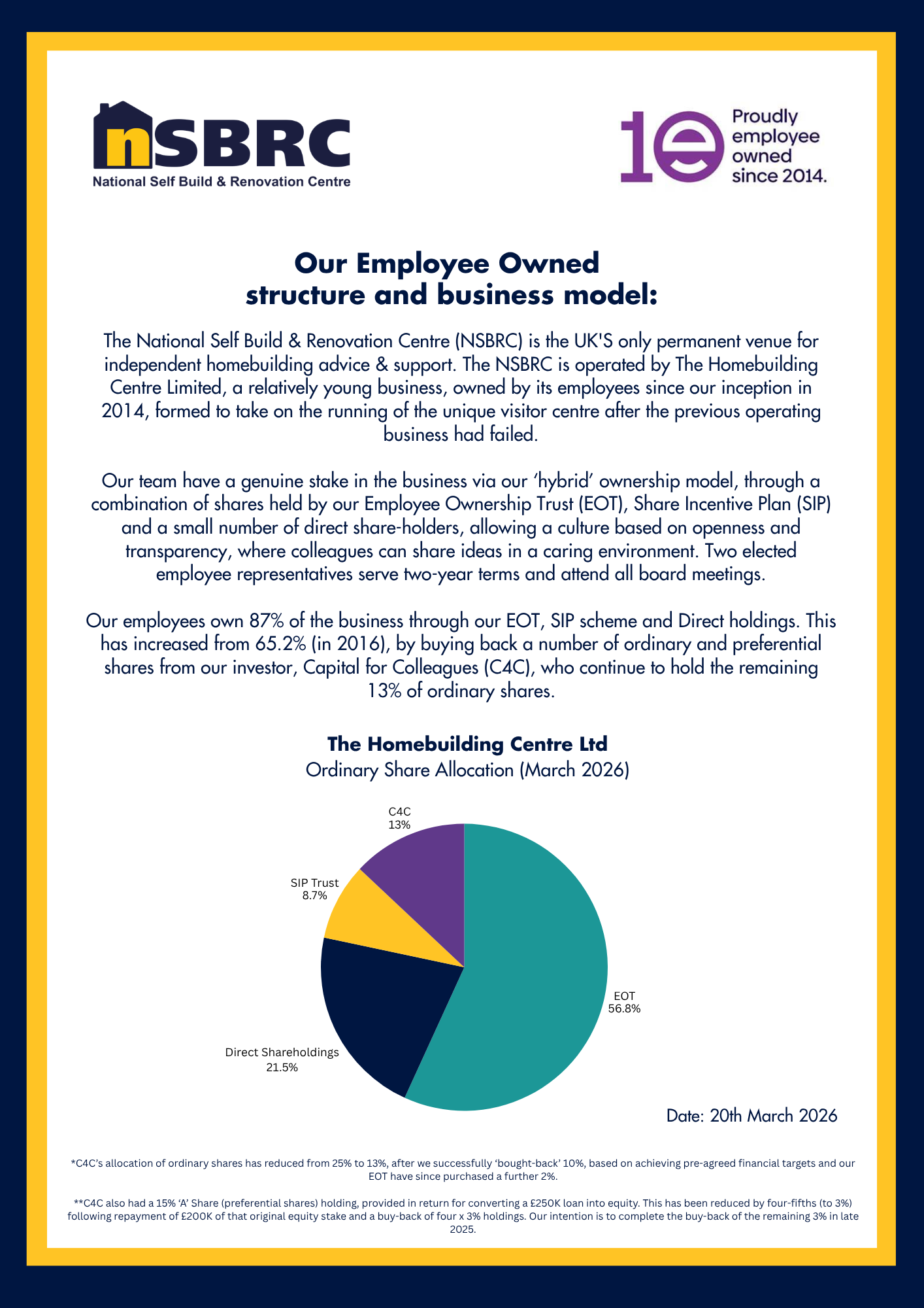 Our employees own 87% of the business through our EOT, SIP scheme and Direct holdings. This has increased from 65.2% (in 2016), by buying back a number of ordinary and preferential shares from our investor, Capital for Colleagues (C4C), who continue to hold the remaining 13% of ordinary shares.